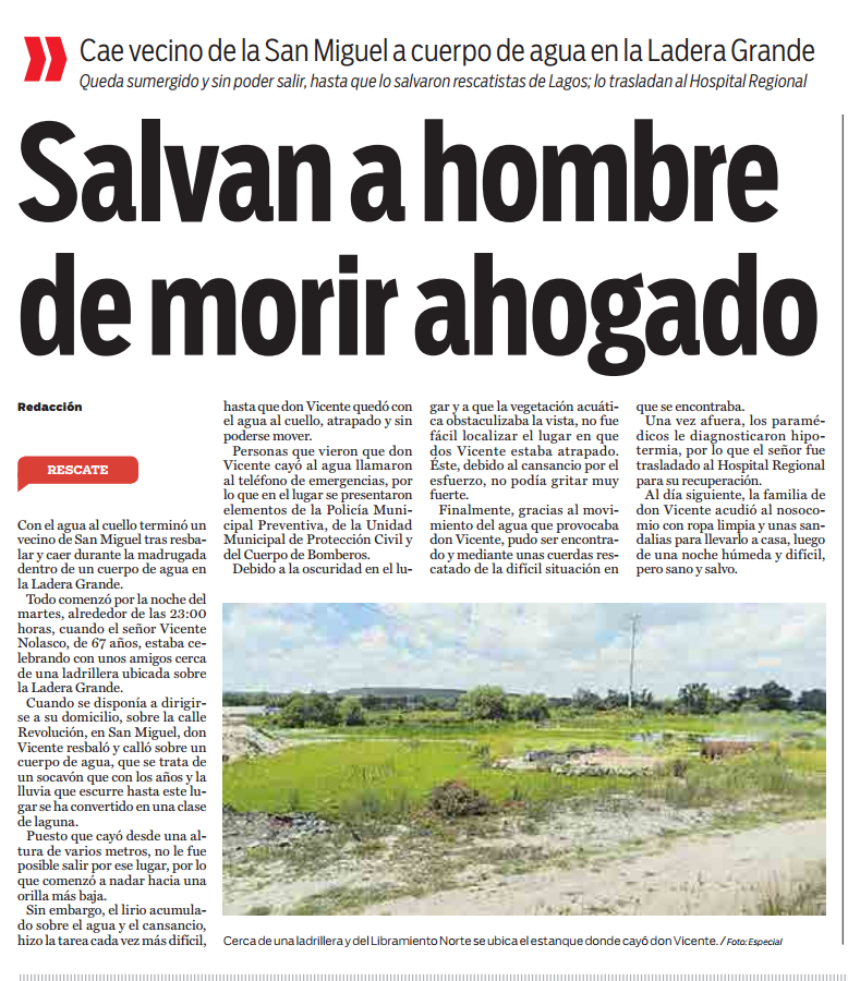 O la historia de don Nolasco, que por andar en una de sus pedas nocturnas cayó a un estanque, donde duró horas con el agua al cuello, hasta que los de Protección Civil lo sacaron tiritando, con hipotermia, pero a salvo. Esa vez estuve cerca de ser el instrumento de la Muerte, cuando llegué a casa de don Nolasco para que me contara su versión, luego de haber oído la de PC, y me abrió la esposa de don Nolasco, quien no sabía nada de lo sucedido y casi le da un paro cuando le dije que su esposo estuvo cerca de ahogarse, ella siempre preocupada por su viejito borracho.